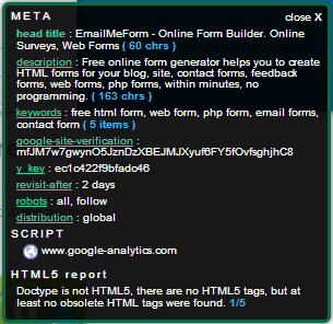 <meta name=”description” content=”Free online form generator helps you to create HTML forms for your blog, site, contact forms, feedback forms, web forms, php forms, within minutes, no programming.”>